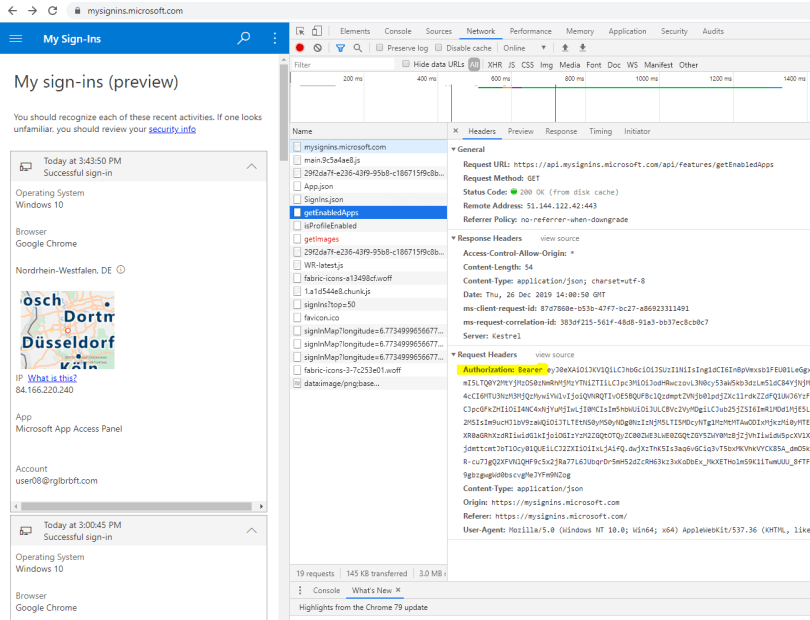 For once, you can view the browser activity using F12 while navigating through the Office portal or My Sign-ins. You can check through the HTTP requests until you find one with the Bearer token in the HTTP request header.