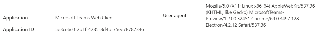 MCAS uses the Linux Teams Client User Agent string to take the decision that this traffic is coming from a desktop application. The string is “Mozilla/5.0 (X11; Linux x86_64) AppleWebKit/537.36 (KHTML, like Gecko) MicrosoftTeams-Preview/1.2.00.32451 Chrome/69.0.3497.128 Electron/4.2.12 Safari/537.36” as can be seen, for example, in the Azure AD Sign-ins.
