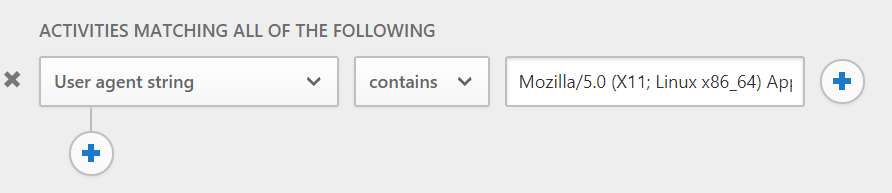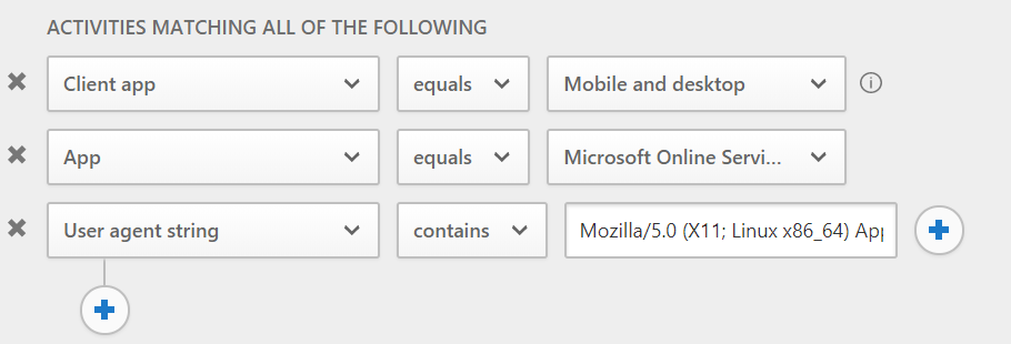 This will prevent the Microsoft Teams Client for Linux, it will prevent the User agent spoofed browser sessions, but leave all other Mobile and desktop apps unaffected. The downside is: it will no longer work once Microsoft changes only one character in the Teams Client for Linux User agent string. Unfortunately, putting a regular expression like Linux.*MicrosoftTeams.*Electron into the field is not possible, neither is it possible to specify a filter like User Agent string contains Linux AND User Agent string contains MicrosoftTeams AND User Agent string contains Electron because there can be only one User Agent string contains expression in the filter. Putting MicrosoftTeams or MicrosoftTeams-Preview into the field is an option because these strings do not occur in the User agent string for the Windows or MacOS Teams client.