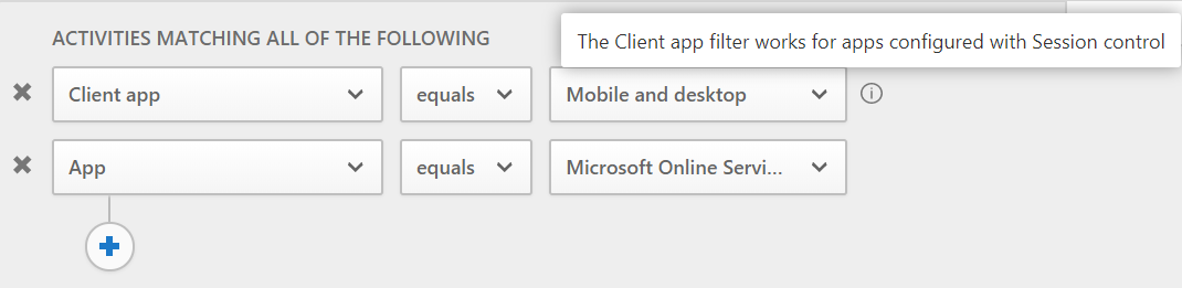 The filter must include the “Client app equals Mobile and desktop” expression (the information notification mentions that this filter works for apps with session control). Whenever “Client app” is specified in the filter, then also “App” needs to be specified in the filter, otherwise the access policy cannot be saved. Using “Microsoft Online Services” as App, the resulting filter looks like this: