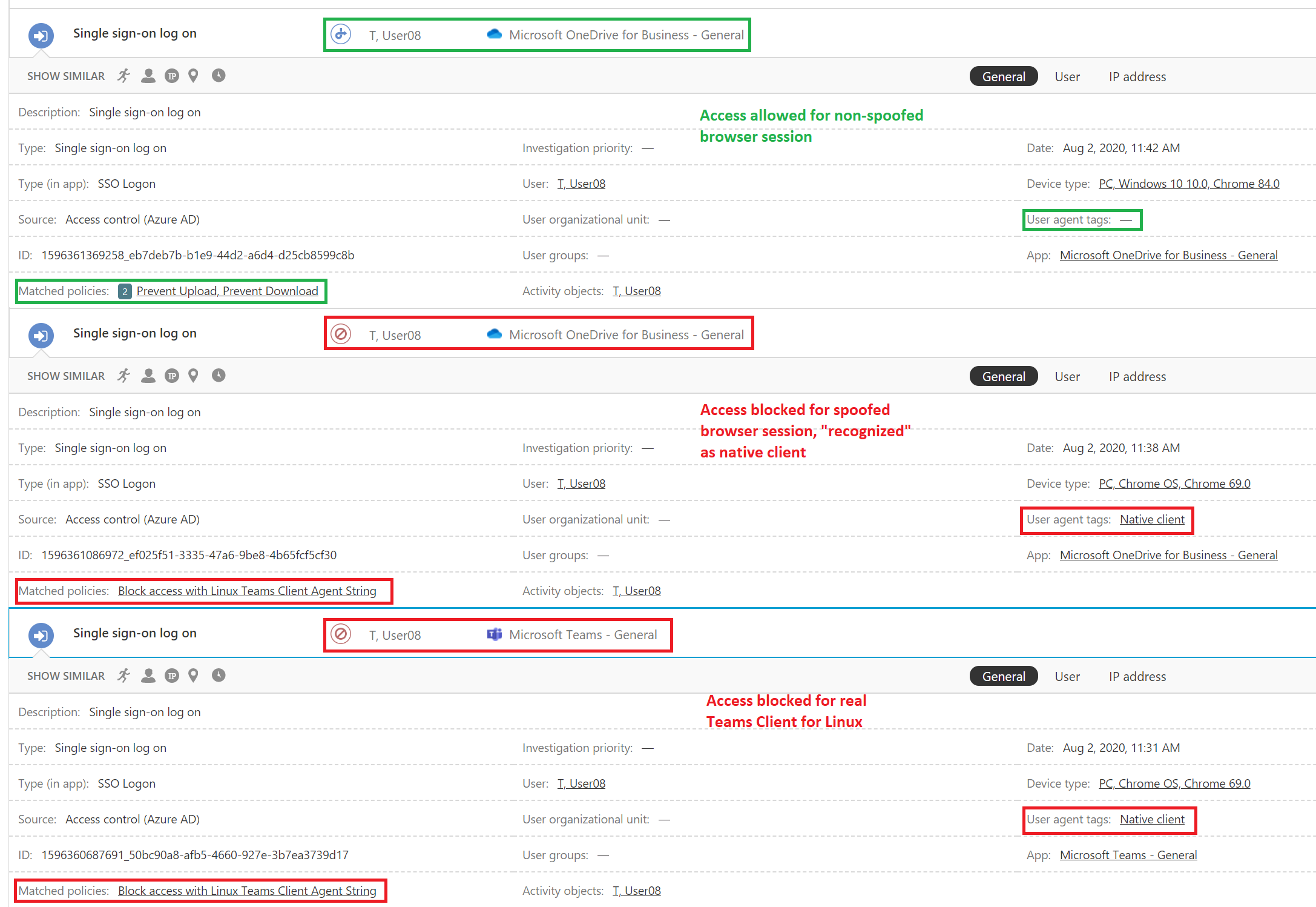 The MCAS activity log shows the blocked access for the Microsoft Teams Client for Linux and for the spoofed browser session and also shows the allowed access for the non-spoofed browser session: